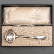 2e gehalte zilveren soepdienlepel, Haags lof, meester: Gerritsen, Amsterdam en Zeist, 1921, gewicht 204 gram, 28 × 9 cm, in cassette