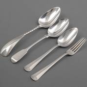 Divers 1e en 3e gehalte klein zilver: dinercouvert Haags lof, en twee dienlepels, waaronder rondfilet, diverse meesters en jaren, gewicht 297 gram, 25 cm