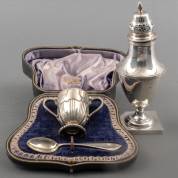 1e gehalte zilveren bokaaltje en lepel, Londen, 1924, in cassette, daarbij: balustervormige 1e gehalte zilveren strooier, meester: S. Blanckensee & Sons Ltd., Birmingham, 20e eeuw -deukje en gravering-, gewicht 192 gram, strooier 17 × 5,3 × 5,3 cm