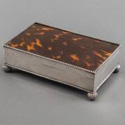 2e gehalte zilveren doosje op vier bolpootjes, de bodem en deksel ingelegd met schildpad, brutogewicht 285 gram, 13 × 8 × 4 cm -bodem los-