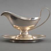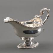 1e gehalte zilveren saucière, de randen gedecoreerd met knorren, meester: S. Blanckensee & Sons Ltd., Londen, 1932, gewicht 358 gram, 20 × 9 × 14 cm