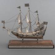 2e gehalte zilveren modelschip: driemaster op houten basement met gegraveerd zilveren plaatje, brutogewicht 420 gram, 18 × 6 × 18 cm