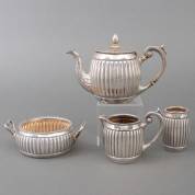 2e gehalte zilveren theeservies met geribbelde wanden, bestaande uit: theepotje, roomstel en lepelvaasje, meester: J.M. van Kempen, Voorschoten, 1902, gewicht 713 gram, theepot 12,5 × Ø 9,5 cm