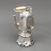 Zeskantige 2e gehalte zilveren bouilloire met gegraveerd floraal decor, het deksel bekroond door bloeiende bloem, het hengsel van mammoet-ivoor, meester: J. van de Wall, Arnhem, 1848-1858, brutogewicht 1745 gram, hoogte met opstaande greep op komfoor 42 cm -kleine defecten aan de opengewerkte rand van het komfoor, bloem op de deksel los-