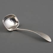 Gladde 2e gehalte zilveren sauslepel met puntig steeluiteinde, meester: Jacobus van Vorst, Rotterdam, 1850, gewicht 72 gram, 17 × 6,5 cm