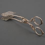 2e gehalte zilveren toasttang met ajourgezaagd bladdecor, gewicht 45 gram, 3,5 × 5 × 15 cm