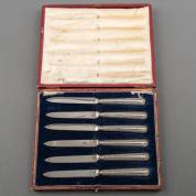 Zes 1e gehalte zilveren fruitmesjes, Sheffield, 1899, brutogewicht 120 gram, 16 cm, in cassette