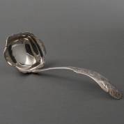 Zilveren sauslepel met gegraveerd bloem- en rocailledecor op de steel en rand, meester: H.A. Schuss, Amsterdam, 1851, gewicht 95 gram, 9 × 6,8 × 21 cm