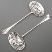 Paar zilveren visscheppen met ovale, ajourgezaagde bak met rocailledecor, meester: Arnoldus Koolhaas, Utrecht, 1738 -inscriptie '6 ons 4 E', de ander '6 ons 5 E', gewicht 374 gram, 34 cm