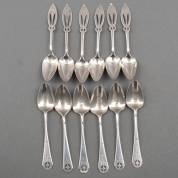 Zes 2e gehalte zilveren dessertcouverts, meesters: Van Kempen & Begeer en Gerritsen & Van Kempen, Zeist, begin 20e eeuw, gewicht 509 gram, 18 cm