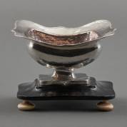 2e gehalte zilveren deels gegraveerde pijpkomfoor met roodkoperen binnenschaaltje en zwartgepolitoerd houten basement, staande op vier benen pootjes, brutogewicht 381 gram, 14,5 × 12 × 11 cm -restauratie in de bak-