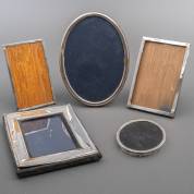 Vijf diverse zilveren fotolijsten, 1e en 2e gehalte, binnenmaat ovale lijst 17,5 × 12,5 cm -defecten-