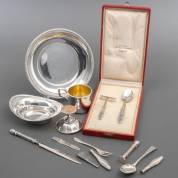 Divers zilverwerk, diverse gehaltes, waaronder ronde schaal met parelrand, brutogewicht 602 gram, schaal Ø 19 cm -defecten-