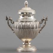 3e gehalte zilveren bokaal met deksel, acanthusbladdecor, cannelures, eikelvormige knop en twee grepen in de vorm van een zeewezen, Italië, brutogewicht 324 gram, 15,5 × 7,8 × 17 cm