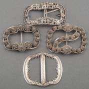 Vier 2e gehalte zilveren schoengespen, 19e en 20e eeuw, gewicht 145 gram, grootste 10 × 5,5 cm