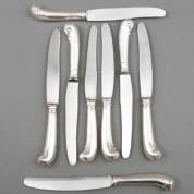 Acht dinermessen met 2e gehalte zilveren pistoolheften met voluutdecor, keuren sleets, 18e/19e eeuw, brutogewicht 964 gram, 23,5 cm
