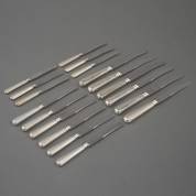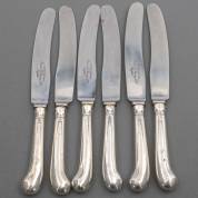 Zes 1e gehalte zilveren kleine messen met pistoolheft, meester: Mappin & Webb, Londen, 1923 -gebruikssporen-, brutogewicht 364 gram, 21,5 cm