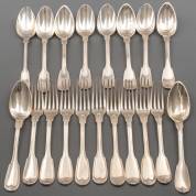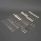 Divers 2e gehalte zilveren couverts en messen: elf grote lepels, acht grote vorken, zes grote messen, dertien dessertlepels, twaalf dessertvorken diverse uitvoeringen en meesters, waaronder meester: H.R.C. Helweg, Amsterdam, gewicht zonder messen 2144 gram, brutogewicht messen 638 gram -messen alleen gekeurd met belastingkeur 1906-1953-