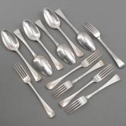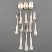 Vijf 2e gehalte zilveren dessertvorken en drie dessertlepels, Haags lof, vorken 1915, lepels 1927, lengte lepels 18,2 cm, gewicht 293 gram -sleets-