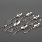 Zes 2e gehalte zilveren dessertcouverts met spatelmodel met enkel lof, meester: Rudolf Helweg, Amsterdam, 1795, gewicht 485 gram, 18 cm