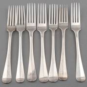 Zeven 2e gehalte zilveren dinervorken, Hollands glad, diverse meesters en jaren, waaronder: Bernardus Andreas & Johannes Franciscus van den Broek, Amsterdam, gewicht 372 gram, 20 cm