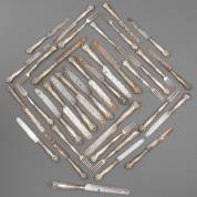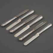 Zes 3e gehalte zilveren mesjes, de heften met alliantiewapen gegraveerd afgezet met koordrand, Oostenrijk-Hongarije, circa 1900, gewicht 355 gram, 20,5 cm