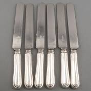 Zes dinermessen met 2e gehalte zilveren geprofileerde heften, de stalen lemmeten gemerkt A.H. Becker, Groningen, brutogewicht 511 gram, 26 cm
