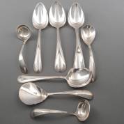 Divers 2e gehalte zilveren dienbestek, rondfilet, diverse meesters en jaren; aardappellepel, drie groentedienlepels -één met verso monogram-, roomlepel, twee sauslepels en een pasteischep, gewicht 565 gram, groentelepel 25 cm