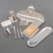 Diverse 1e gehalte zilveren kantoorbenodigdheden waaronder brievenweegschaaltje, daarbij: 2e gehalte zilveren potloodhouder, de blocnotehouder met onedele beugels, brutogewicht zonder glas en blocnote 836 gram -enkele glazen onderdelen met defecten-