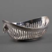 Schuitvormige 1e gehalte zilveren bonbonmandje met leeuwvormige greepjes, spijlendecor en geprofileerde rand, met inscriptie aan de onderzijde, 14 × 11 × 6,5 cm