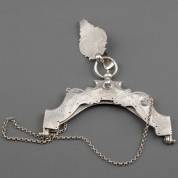 Zilveren tasbeugel met gegraveerd papegaaiendecor waaraan chatelainehaak, meester beugel: Jan Roozenburg, Schoonhoven, 1787, gewicht 319 gram, 18 × 15 cm