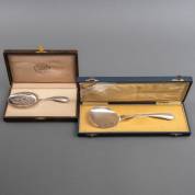 2e gehalte zilveren pasteischep met parelrand, meester: J.M. van Kempen & Zonen, Voorschoten, 1883, en 2e gehalte zilveren ajourgezaagd schepje, gewicht 107 gram, pasteischep 24 cm, beide in cassette