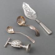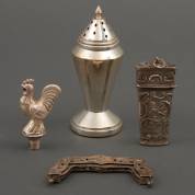 Divers zilverwerk, diverse gehaltes waaronder: 18e-eeuwse zilveren reisnecessaire -defect-, conisch gevormde gladde 1e gehalte zilveren strooier, Birmingham, 1937, brutogewicht 277 gram, strooier 14 cm