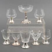 Verzameling van acht diverse glaasjes op 2e gehalte zilveren voetjes, hoogte grootste glas 10,8 cm, brutogewicht 763 gram