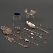 Divers zilverwerk, diverse gehaltes, waaronder bonbonmandje, strooilepel en cakeprikker, gewicht zilver, 362 gram, strooilepel 22 × 6 cm -defecten-