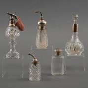 Vijf diverse kristallen flacons met 1e gehalte zilveren monturen en dop, alle Engeland, begin 20e eeuw, 15 cm