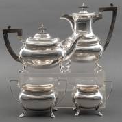 Vierdelig 1e gehalte zilveren koffie- en theeservies met gecontourneerde rand op vier sierlijke pootjes, bestaande uit: koffiekan, theepot, suikerschaal en roomkan, meester: Walker & Hall, Sheffield, 1919, brutogewicht 1988, hoogte koffiekan 24 cm