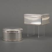 Paar 1e gehalte zilveren koektrommels met koordranden, rechthoekig en rond model, meester: Jan George Grebe Jr., Rotterdam, 1837, beide met inscriptie op de onderzijde, gewicht 970 gram, 15 × 10 en Ø 13 × 8,5 cm