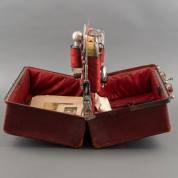 Roodlederen toiletkoffer compleet met toiletgarnituur met 3e gehalte zilveren monturen en deksels, gemonogrammeerd DH of HD -gebruikssporen-, daarbij drie oude foto's van de vermoedelijke originele eigenaresse en een paar lange witte handschoenen, circa 1900, 32 × 45 × 24 cm