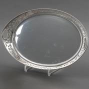 Ovaal 2e gehalte zilveren dienblad, rand ajourgezaagd en afgezet met parelrand, meester: Fa. A. Presburg & Zoon, Haarlem, 1871, gewicht 654 gram, 38 × 23,5 × 24 cm -met inscriptie: in het plat: 'A sagitta volante in die....ps 90' en achterzijde: '17-1-1973'-
