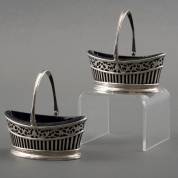 Paar schuitvormige ajourgezaagde zoutschaaltjes met hengsels en blauw glazen binnenbakjes, vermoedelijk meester: Jan Anthonis de Haas, Amsterdam, 1806, brutogewicht 275 gram, 9 × 8,5 × 5 cm -minieme randschilfers van glas-, herkomst: privécollectie van kunsthandelaar Abraham van der Meer (1927-2008), destijds gevestigd op de Spiegelgracht 3 te Amsterdam