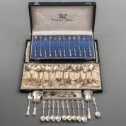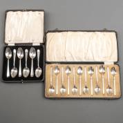 Twaalf 1e gehalte zilveren theelepels, met slanke gegraveerde stelen, Birmingham, 1930, gewicht 93 gram, in cassette en zes gladde 1e gehalte zilveren theelepels, Birmingham, 1931, gewicht 67 gram, in cassette