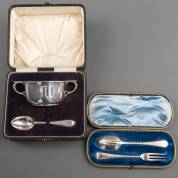 1e gehalte zilveren kom en lepeltje, Birmingham, meester: Adie Brothers Ltd., Birmingham, 1924, in cassette, en 1e gehalte zilveren klein couvert, meester: William Gibsen & John Langman, Londen, 1885, gewicht 240 gram, in cassette