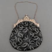Zwart stoffen damestas met 2e gehalte zilveren tasbeugel gedecoreerd met gegraveerde vogels en zeilboot, aan jasseron schakelketting, meester: Adrianus Hoolbis Lazonder, Schoonhoven, 1833, brutogewicht 205 gram, 28 × 19 cm