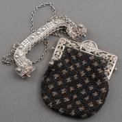 Kralenbeursje met zilveren beugel, en losse zilveren tasbeugel, losse beugel 11,1 cm breed, brutogewicht 157 gram