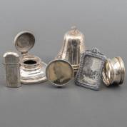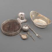 Divers klein zilverwerk, diverse gehaltes, waaronder: luciferdooshouder, parfumflacon met glazen binnenstop en twee kaasduimpjes, gewicht zilver minimaal 185 gram