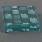 Glazen kunstobject met zeven zilveren vierkantjes getiteld 'Perspectief', ontwerp: Hein Antheunis, uitvoering: Koninklijke Van Kempen en Begeer, Voorschoten, 1997, oplage van 200, in box met blauw fluweel, 10,5 × 10,5 × 3 cm