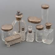 Diverse geslepen kristallen flacons met veelal 1e gehalte zilveren doppen en monturen, gewicht zilver tenminste 120 gram, hoogste flacon 9 cm