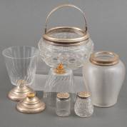 Twee kristallen glazen op 2e gehalte zilveren voet, daarbij: draadglazen lepelvaasje, kristallen schaaltje met 2e gehalte zilveren montuur en twee glazen strooiertjes