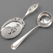 2e gehalte zilveren pasteischep, 1871, en 1e gehalte zilveren sauslepel, Hollands glad, 1936, gewicht 98 gram, 18 cm